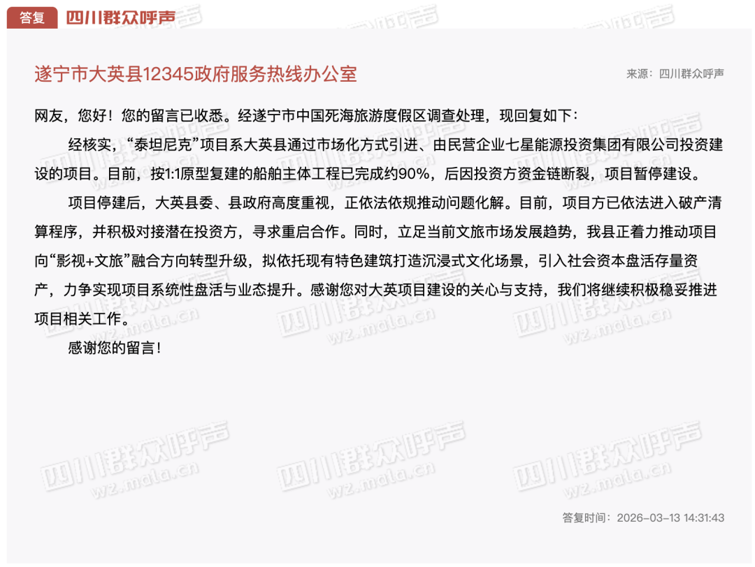 3月13日,遂宁市大英县12345政府服务热线办公室对此进行了答复,称经遂宁市中国死海旅游度假区调查处理,现回复如下:“经核实,‘泰坦尼克号’项目系大英县通过市场化方式引进、由民营企业七星能源投资集团有限公司投资建设的项目。目前,按1:1原型复建的船舶主体工程已完成约90%。项目停建后,大英县委、县政府高度重视,正依法依规推动问题化解。目前,项目方已依法进入破产清算程序,并积极对接潜在投资方,寻求重启合作。同时,立足当前文旅市场发展趋势,我县正着力推动项目向‘影视+文旅’融合方向转型升级,拟依托现有特色建筑打造沉浸式文化场景,引入社会资本盘活存量资产,力争实现项目系统性盘活与业态提升。感谢您对大英项目建设的关心与支持,我们将继续积极稳妥推进项目相关工作。”