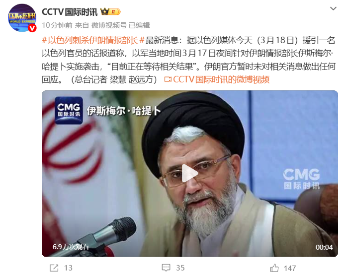 据以色列媒体今天(3月18日)援引一名以色列官员的话报道称,以军当地时间3月17日夜间针对伊朗情报部长伊斯梅尔·哈提卜实施袭击,“目前正在等待相关结果”。伊朗官方暂时未对相关消息做出任何回应。