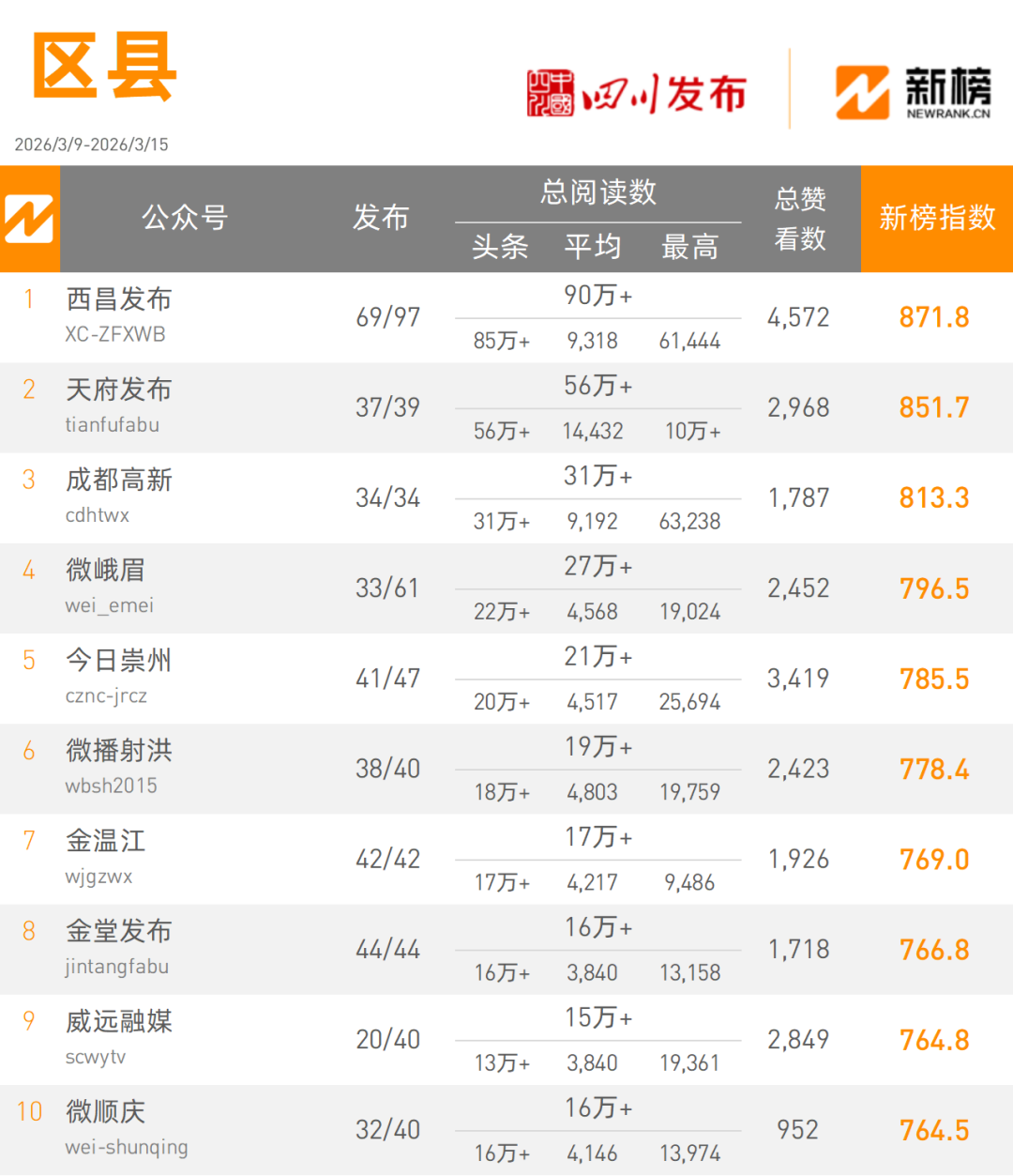 在本周区县榜单中,“西昌发布”发文97篇,以900000+次阅读量总数,871.8的新榜指数摘得区县类榜单桂冠;“天府发布”发文39篇,以560000+次阅读量总数,851.7的新榜指数获得区县类榜单亚军。