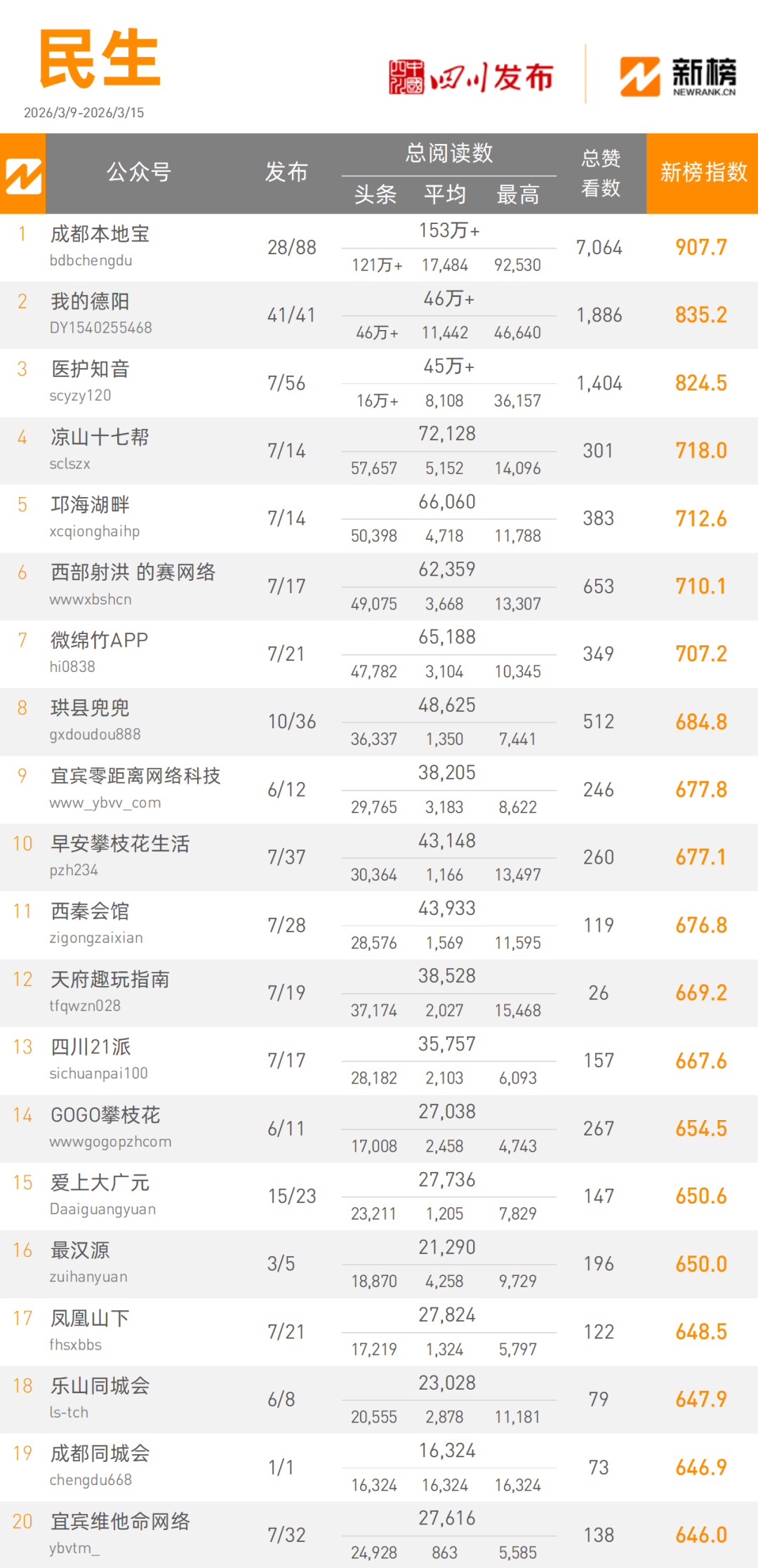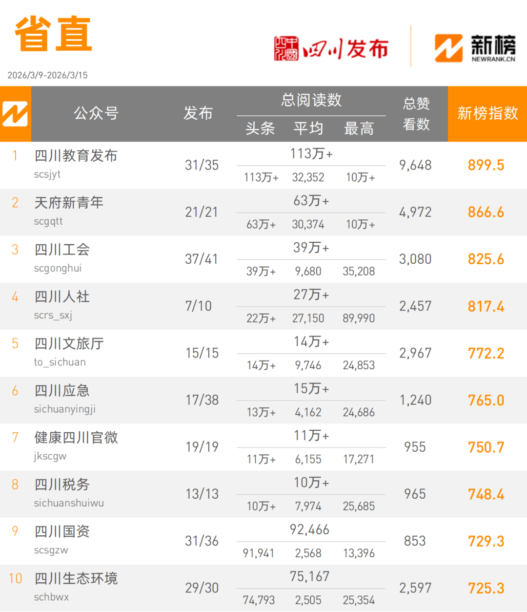 榜单整理了目前四川地区政务微信公众号排行情况,由新榜提供数据支撑,由四川发布在四川地区独家权威发布,包括省直部门、市(州)、县(区、市)三大类,每周发布。