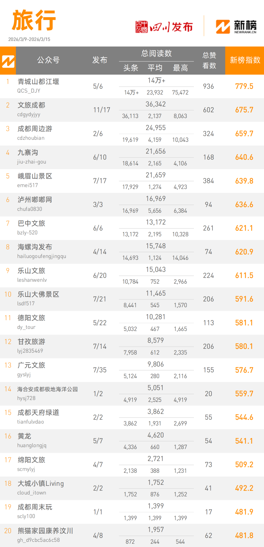 “青城山都江堰”本周以140000阅读量总数,779.5的新榜指数摘得旅行类榜单桂冠,“文旅成都”本周以36342阅读量总数,675.7的新榜指数将旅行类榜单榜眼收入囊中。