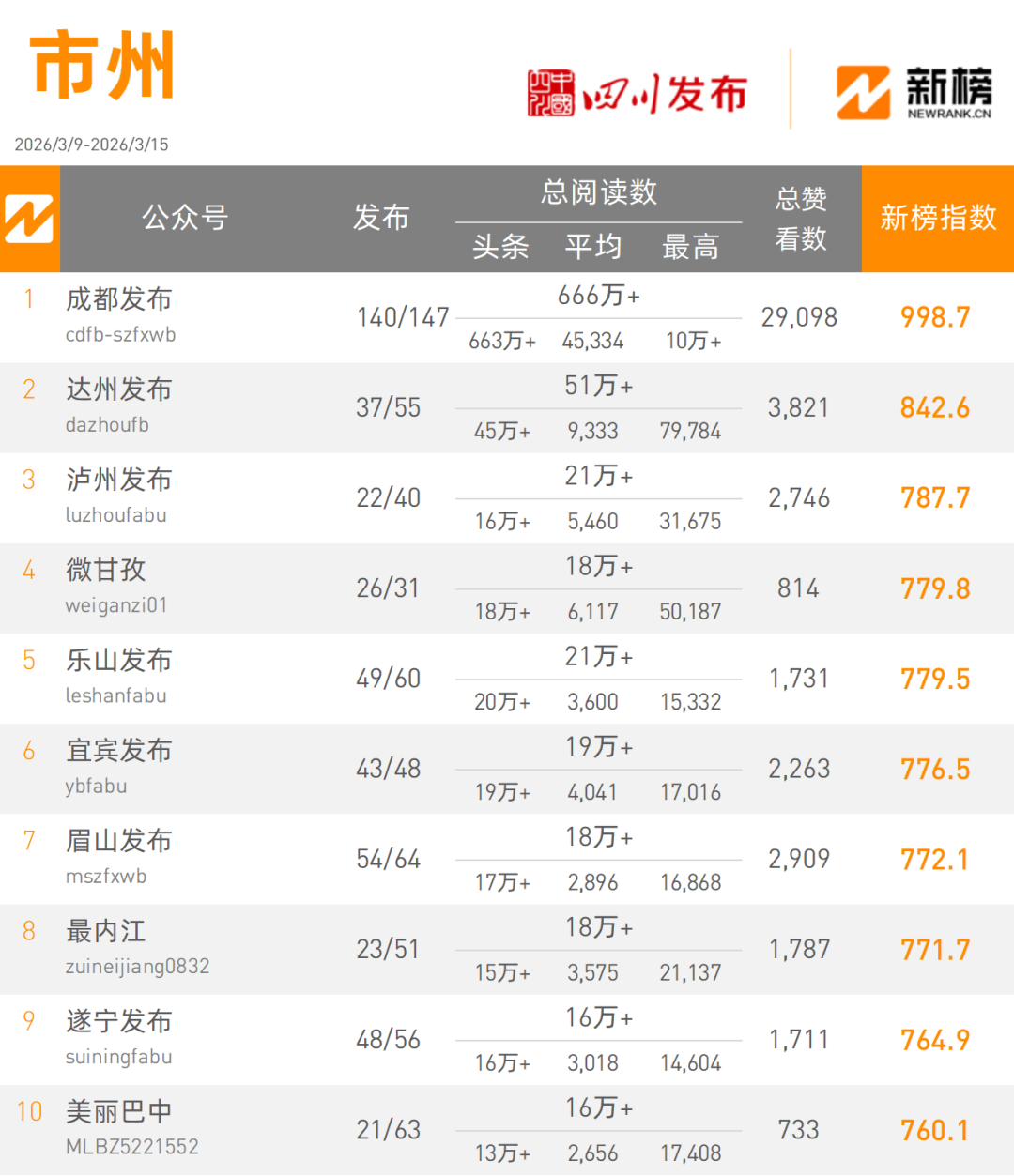 在本周市(州)榜单中,“成都发布”发文147篇,以6660000+次阅读量总数998.7的新榜指数摘得市州类榜单桂冠;“达州发布”发文55篇,以510000+次阅读量总数,842.6的新榜指数获得市(州)类榜单亚军。