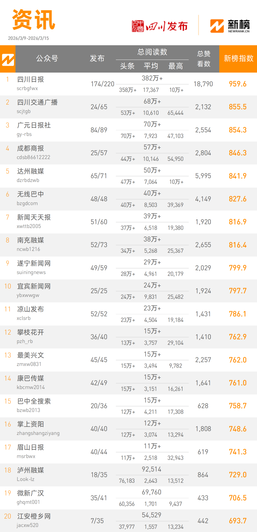 “四川日报”以3820000+次阅读量总数,959.6的新榜指数获得资讯类榜单第一名,“四川交通广播”本周以680000+次阅读量总数,855.5的新榜指数占据资讯类榜单第二名。