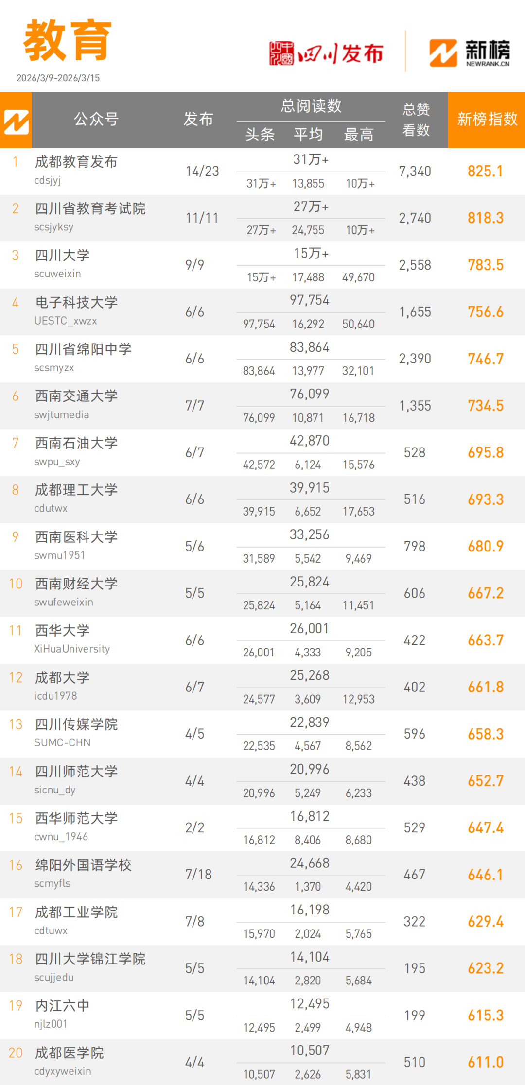 “成都教育发布”本周以310000+次阅读量总数,825.1新榜指数领跑教育类榜单,“四川教育考试院”本周以270000+次阅读量总数,818.3新榜指数获得教育类榜单第二名。