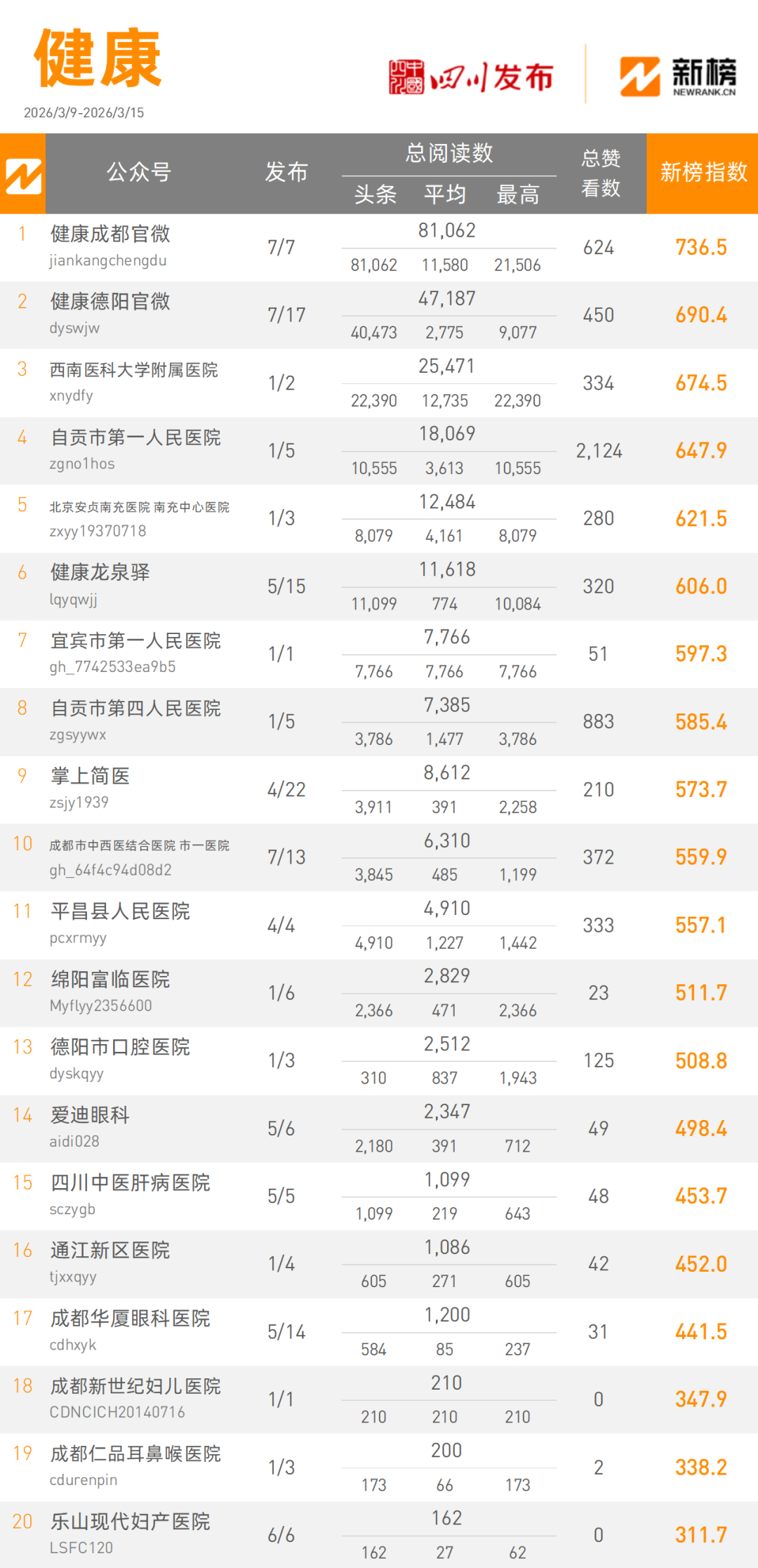 “健康成都官微”本周以81062次阅读量总数,736.5的新榜指数占据健康类榜单冠军宝座,“健康德阳官微”凭借47187阅读量总数,以690.4的新榜指数获得健康类榜单亚军。