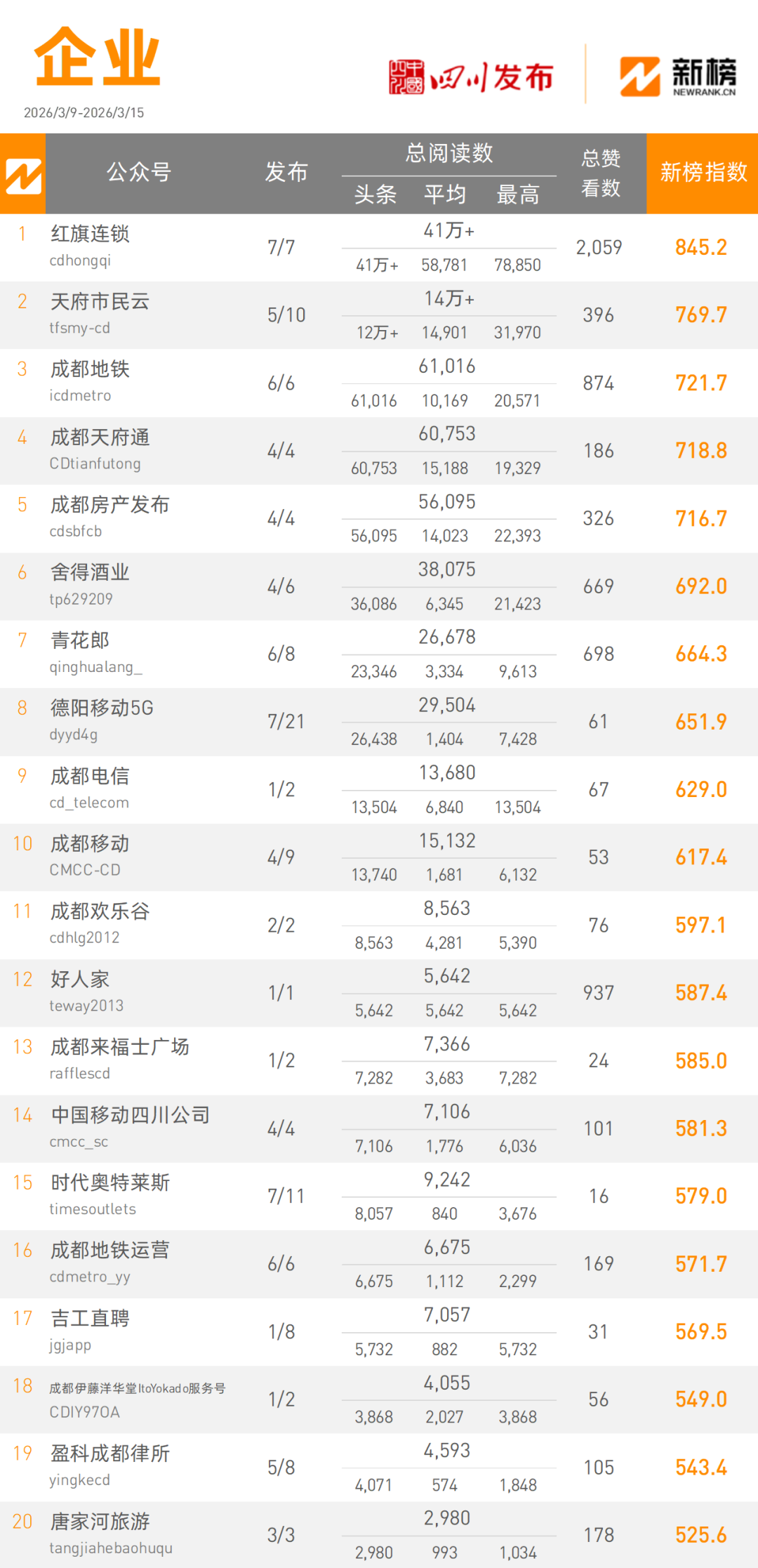 “红旗连锁”本周发文7篇,以410000+次阅读量总数坐上企业类榜单头把交椅,“天府市民云”本周发文10篇,以140000+次阅读量总数位居企业类榜单次席。