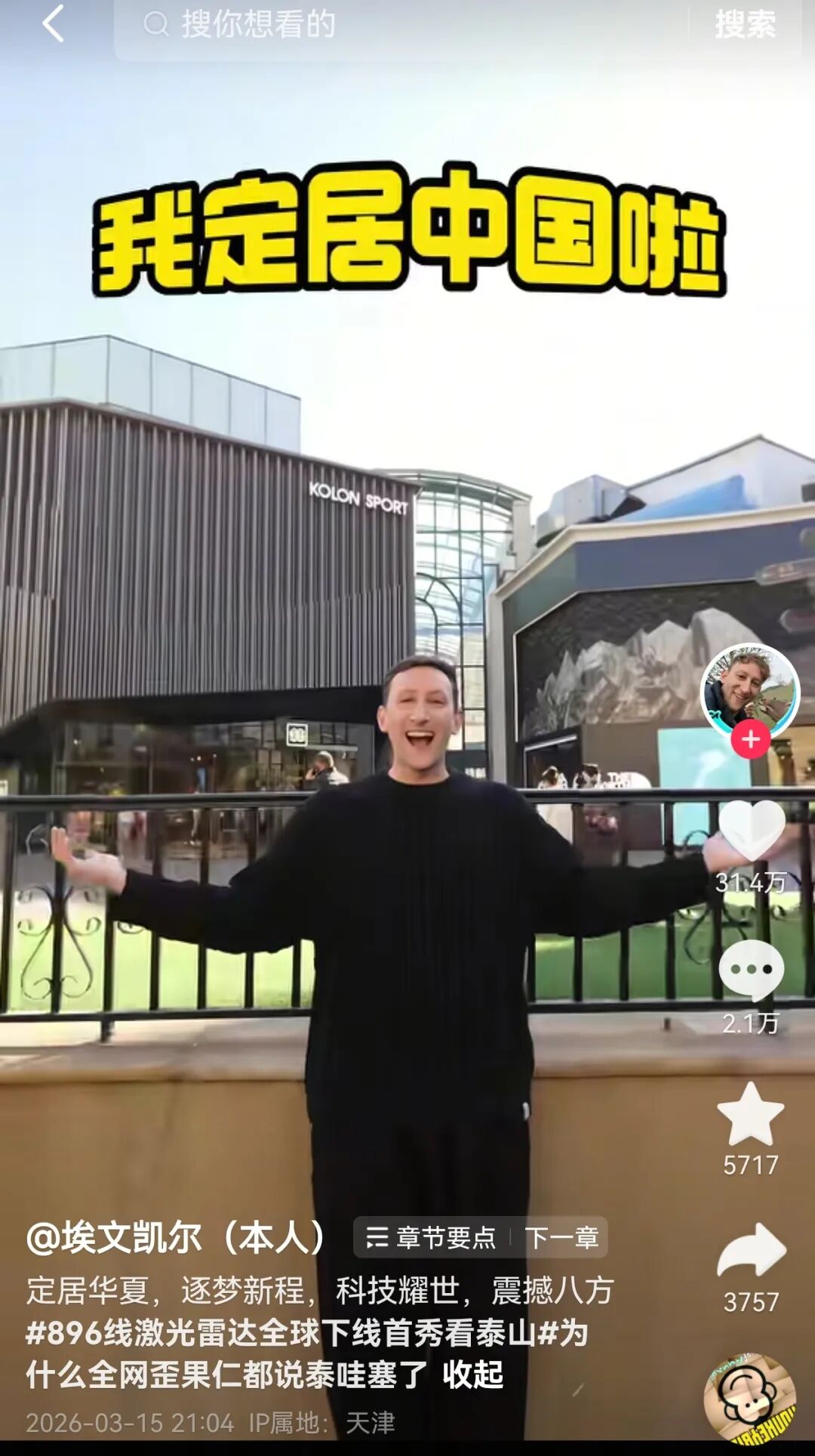 美国小伙埃文·凯尔3月15日在社交媒体发视频,宣布定居中国。IP定位为天津。