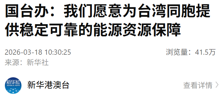 3月18日,国务院台办举行例行新闻发布会。有记者问,近期由于中东局势动荡,台湾岛内能源面临断油、断气危险,岛内各界高度关切能源资源储备和供应问题。这也让舆论注意到,大陆方面去年10月首度提出统一后台湾会有“七个更好”,其中包括“和平统一之后,有强大祖国做后盾,台湾能源资源保障会更好”。请问对此有何阐释?