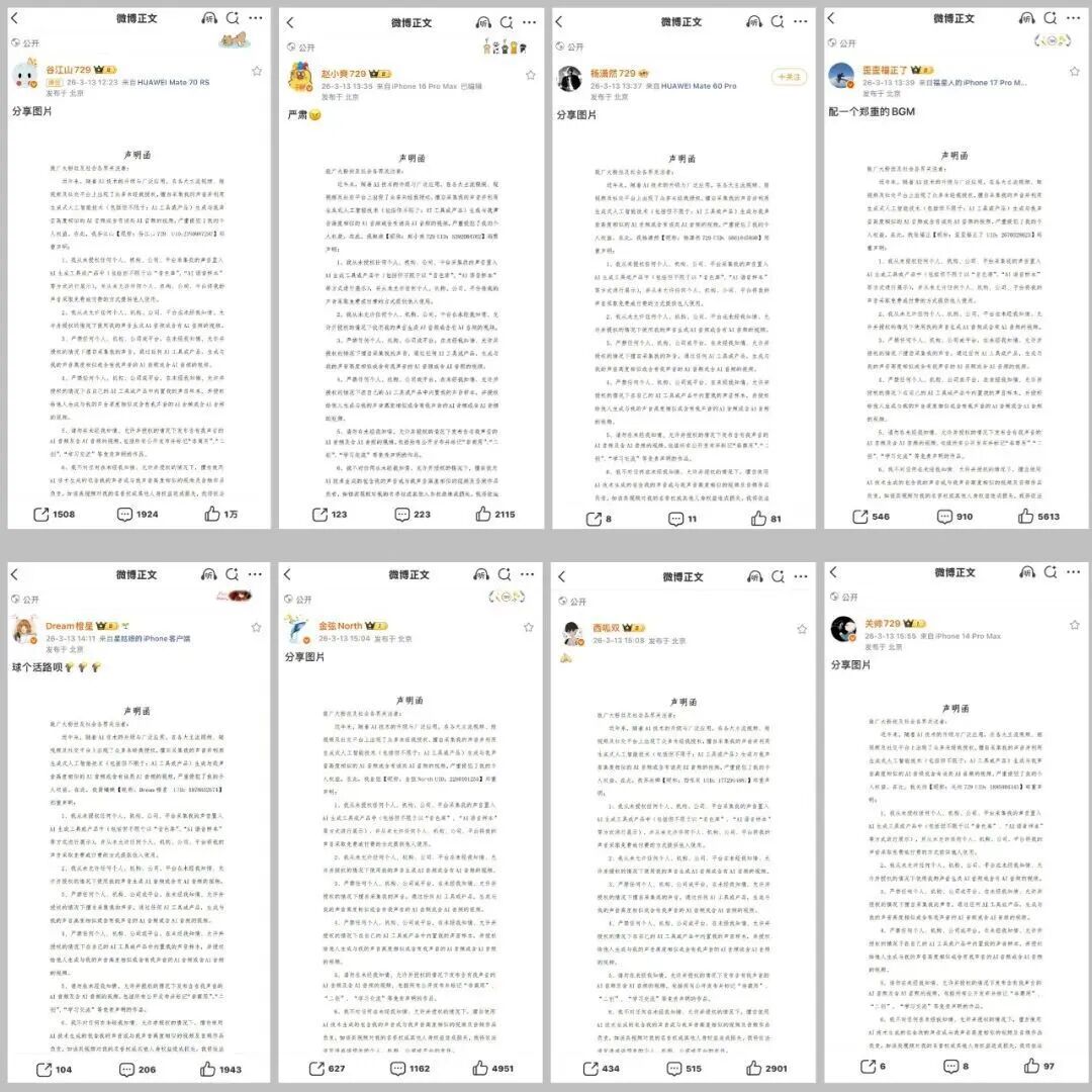 他们在声明函中均提到,对于未经授权生成、发布的包含其声音的AI音频及视频,无论是否标注“非商用”“二创”“学习交流”等免责声明,均属于侵权行为。对于已在网络上传播的侵权AI音视频内容,相关发布者及平台应立即停止传播、下架、删除,并停止继续制作、上传、分发。