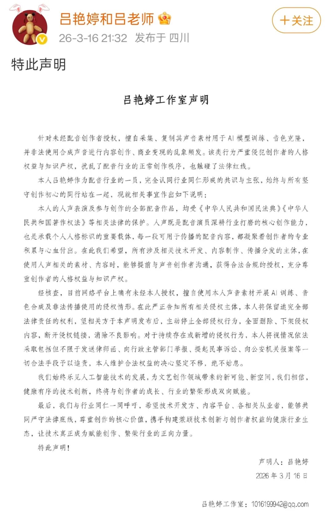 3月16日晚,电影《哪吒》内哪吒的配音演员吕艳婷发布声明:针对未经配音创作者授权,擅自采集、复制其声音素材用于AI模型训练、音色克隆,并非法使用合成声音进行内容创作、商业变现的乱象频发。该类行为严重侵犯创作者的人格权益与知识产权,扰乱了配音行业的正常创作秩序,也触碰了法律红线。