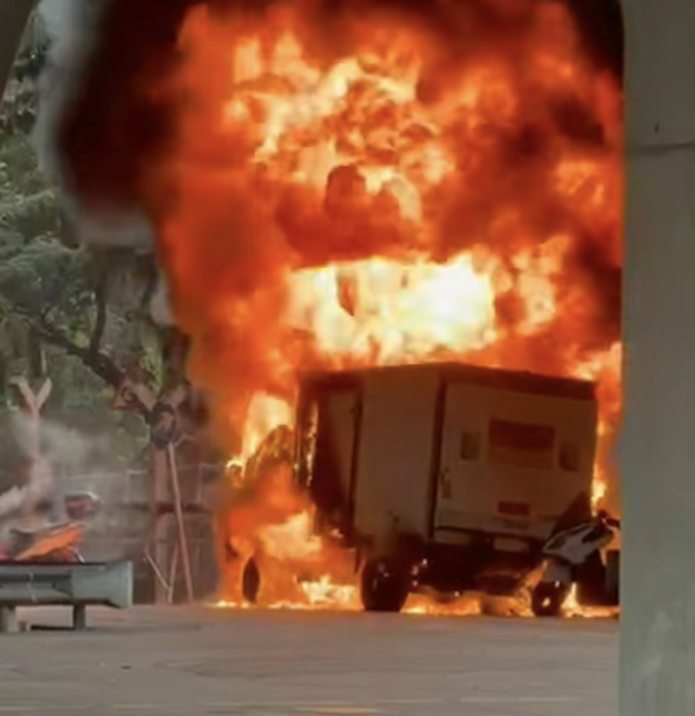公开的现场画面显示,涉事货车燃起熊熊火光,不断冒出黑色浓烟。明火被扑灭后,车身烧毁情况严重。