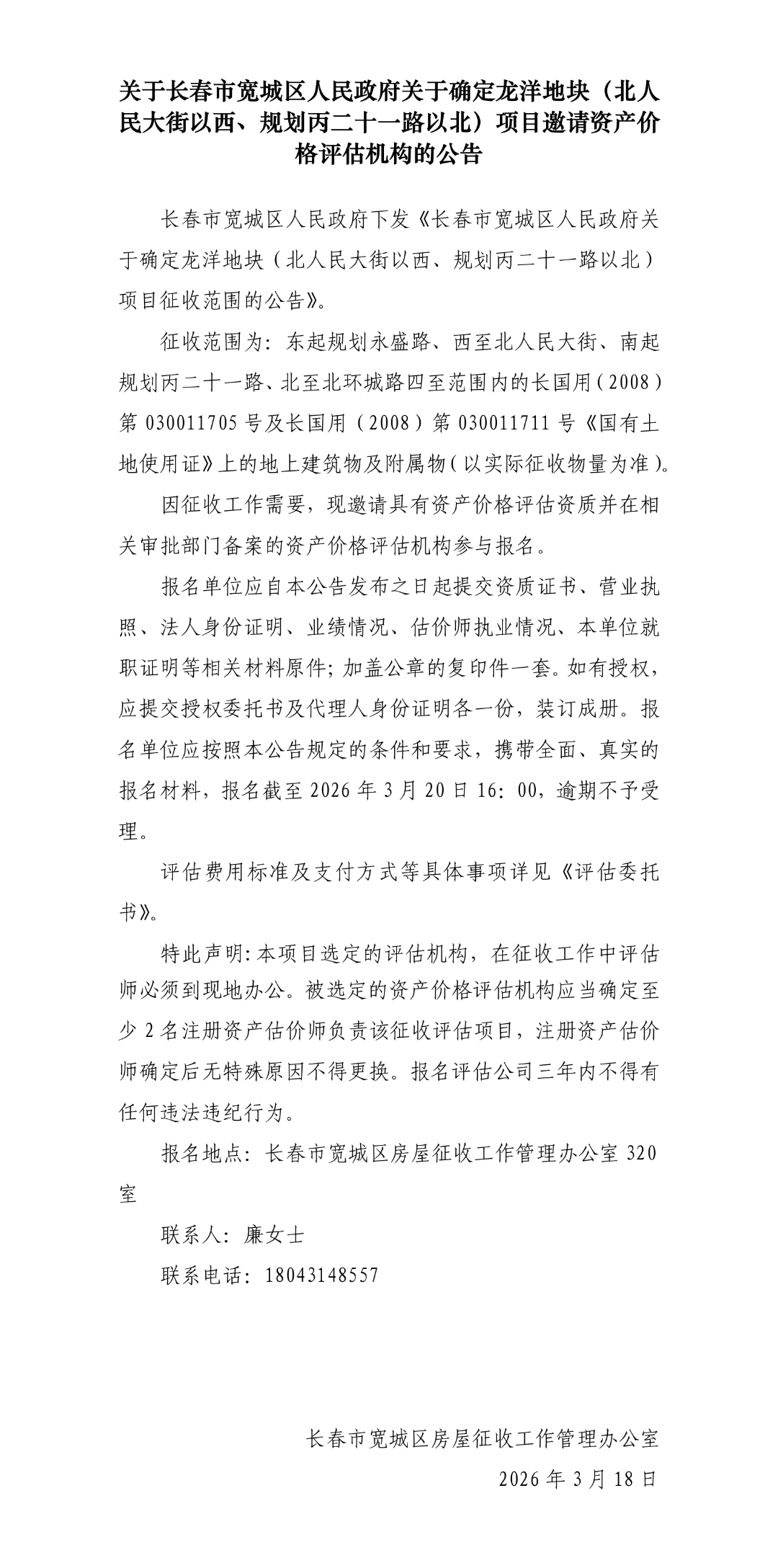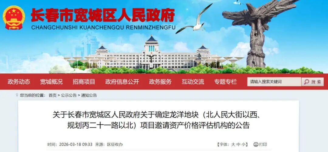 3月18日,长春市宽城区人民政府网站发布《关于长春市宽城区人民政府关于确定龙洋地块(北人民大街以西、规划丙二十一路以北)项目邀请资产价格评估机构的公告》——