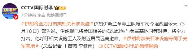 伊朗伊斯兰革命卫队海军司令坦西里今天(3月18日)警告说,伊朗现已将美国相关的石油设施与美军基地同等对待,将全力打击。他呼吁相关设施工人及附近居民远离避难。