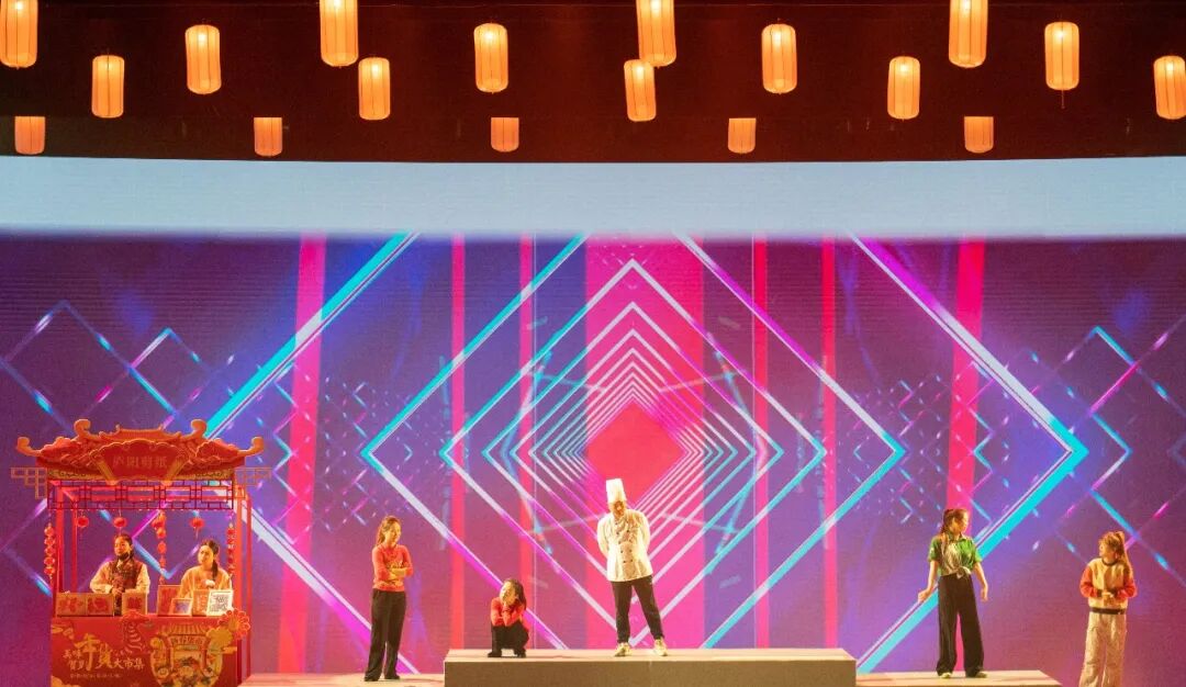 情境舞蹈《融·耀》以立体行进式“民俗风情卷”为设计核心,生动再现合肥市井百态与非遗市集的烟火气息,将江淮大地的人文烟火具象呈现。李小龙介绍,该节目所依托的车台是科技含量极高的数字化机械装置,精准度可达毫米级,而剧场内搭建的60米长车载轨道,更是首次在合肥剧场中运用,为多空间、多层次的舞台表达提供了坚实支撑。