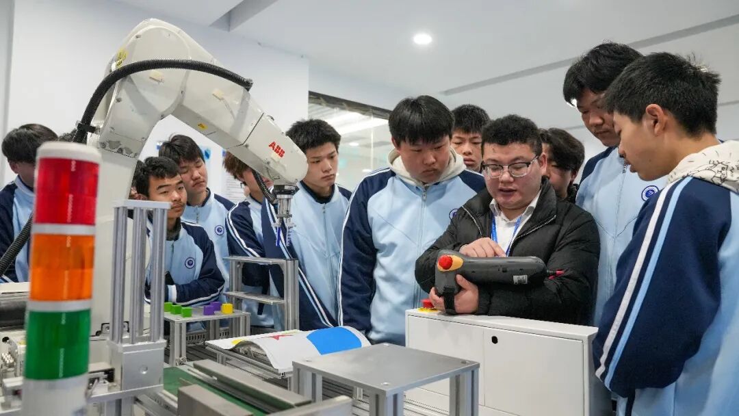 实训课堂上,刚结束理论学习的同学们立刻来到工业机器人技能考核实训台前开展实操练习。大家围在机械臂旁认真观看教师演示,随后亲手操作机械臂完成抓取、搬运等一系列动作。