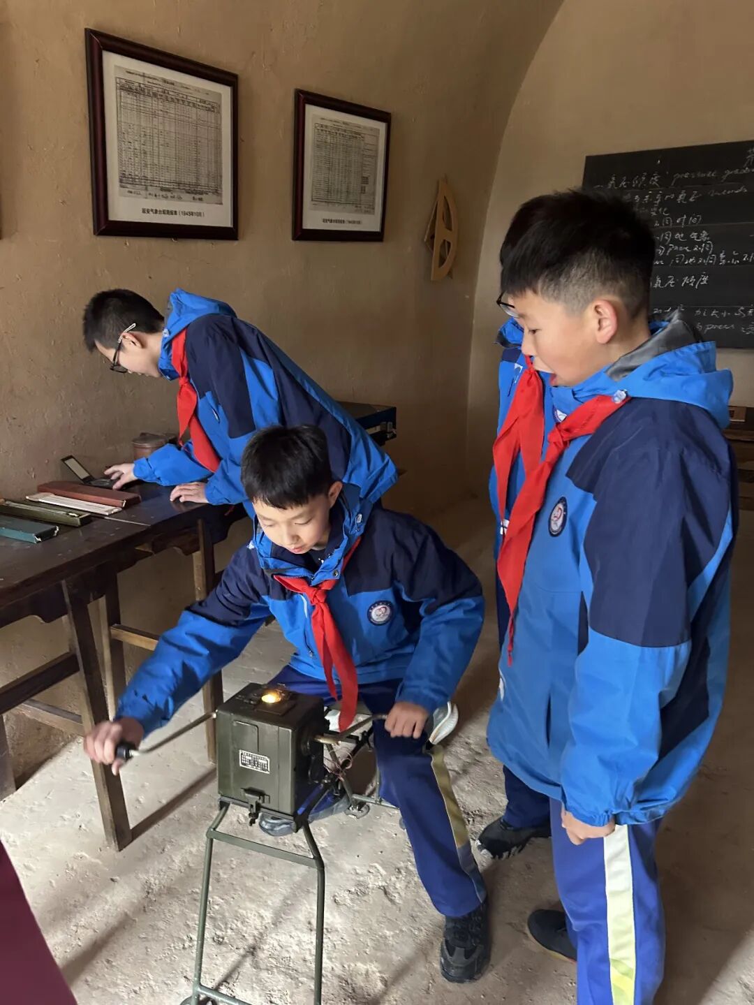 延安小学研学学生在发源地值班室体验手摇发电机使用 图片来源:陕西省气象局