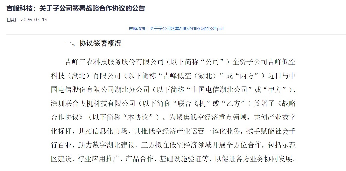 3月18日晚间,吉峰科技(300022)发布公告称,公司全资子公司吉峰低空科技(湖北)有限公司近日与中国电信股份有限公司湖北分公司、深圳联合飞机科技有限公司(以下简称:“联合飞机”)签署了《战略合作协议》。为聚焦低空经济重点领域,共创产业数字化标杆,共拓信息化市场,共推低空经济产业运营一体化业务,携手赋能社会千行百业,助力数字湖北建设,三方拟在低空经济领域开展全方位合作,包括示范区建设、行业应用推广、产品合作、基础设施验证等,以促进各方业务协同发展。