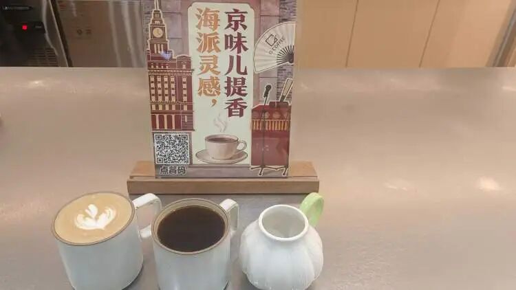 影剧院二楼剧场外有配套的咖啡服务区域,目前咖啡机的安装调试已经完成,一块有点餐码的牌子上写着“海派灵感,京味儿提香”。咖啡师为现场的工作人员做了美式咖啡和拿铁,用马克杯装咖啡。