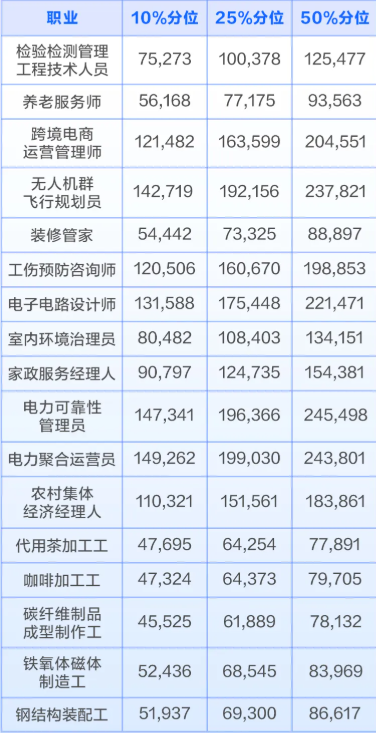 2025年7月,人力资源和社会保障部发布了17个新职业。据白皮书调查统计,这17个新职业中,年收入中位数(50%分位)排名从高到低的前十位依次是:电力可靠性管理员、电力聚合运营员、无人机群飞行规划员、电子电路设计师、跨境电商运营管理师、工伤预防咨询师、农村集体经济经理人、家政服务经理人、室内环境治理员、检验检测管理工程技术人员。