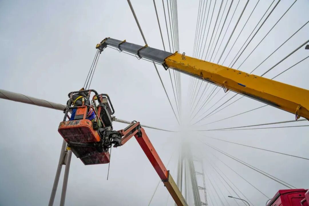●3月17日,巢马城际铁路马鞍山长江公铁大桥施工现场,中铁大桥局施工人员坚守岗位,冒雨为大桥安装斜拉索减震器。目前,该桥已完成合龙与铺轨,进入附属设施安装、桥面系施工等收官冲刺阶段,为巢马城际铁路年内具备开通条件奠定坚实基础。