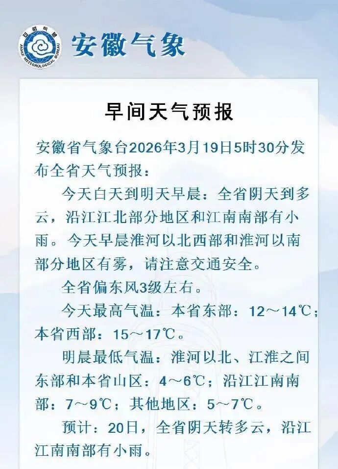 ●据安徽省气象台最新预报,19日至22日全省气温逐渐回升,22日全省大部分地区最高气温19~22℃。虽然气温即将升起来,但雨水并不打算“休息”。未来一周,安徽省仍多阴雨天气。