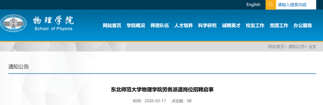 3月17日,东北师范大学物理学院网站发布《东北师范大学物理学院劳务派遣岗位招聘启事》。具体内容如下: