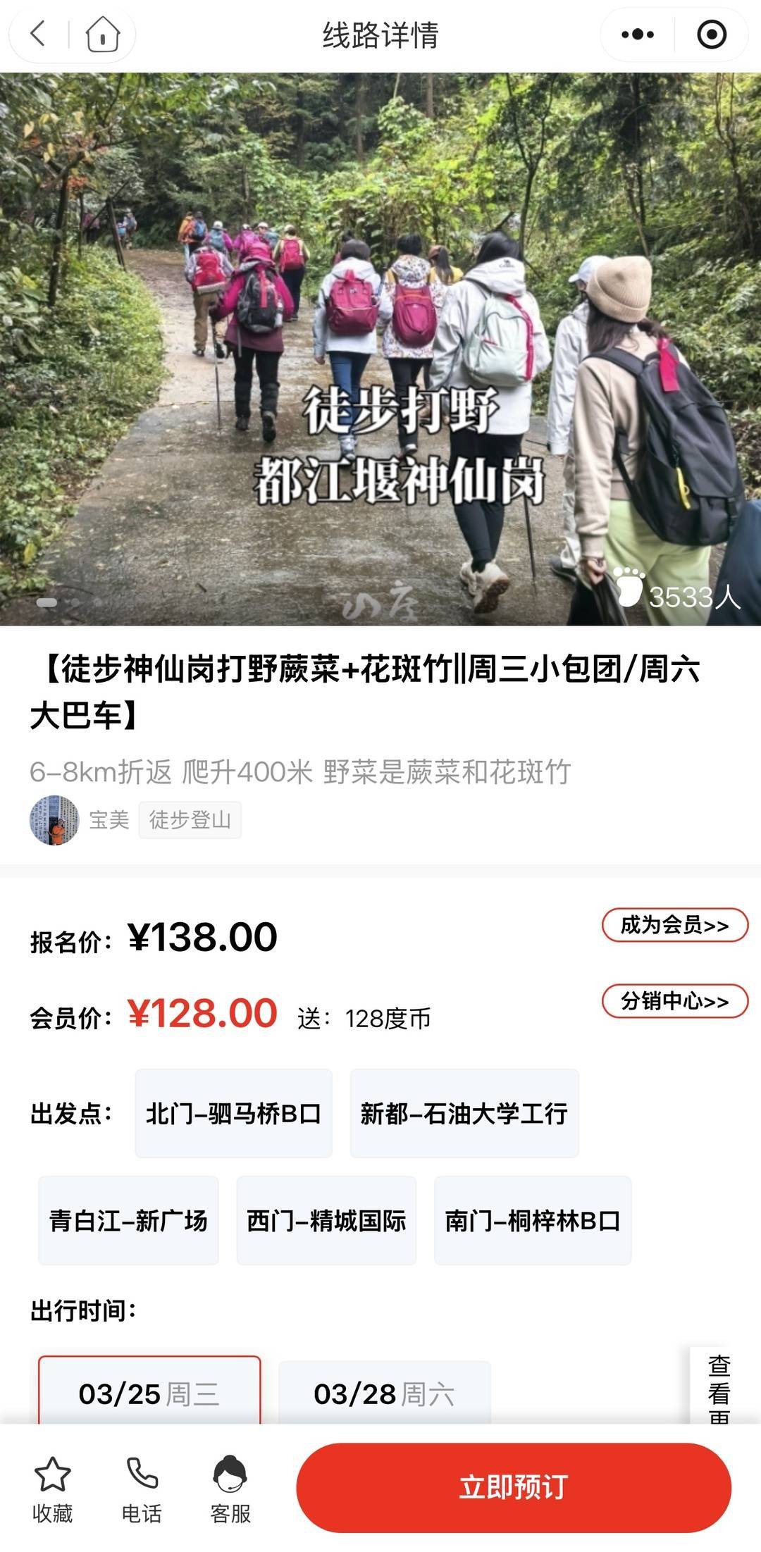 3月19日,封面新闻记者查询发现,成都市面上已衍生出不少针对“打野”的户外徒步群,群里主要是推销户外机构推出的徒步打野团。以彭州葛仙山、邛崃南宝山、大邑雁鹅村、崇州大坪山等热门路线为例,7座商务车的报名费为每人128元,主打的就是“打野+轻徒步”。每到周末这些徒步“打野”团就走众多年轻人报名,很快会报满。