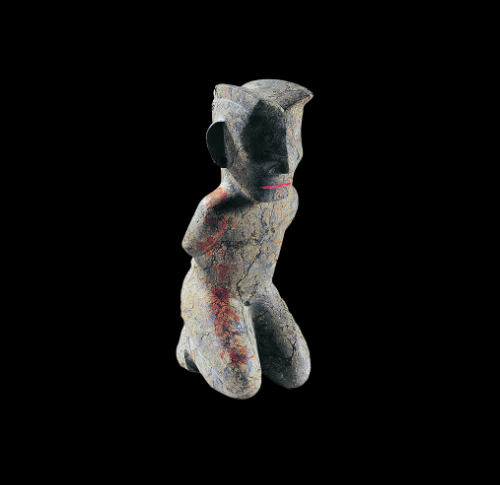 商周跪坐人像上的红色彩绘(图据成都金沙遗址博物馆)
