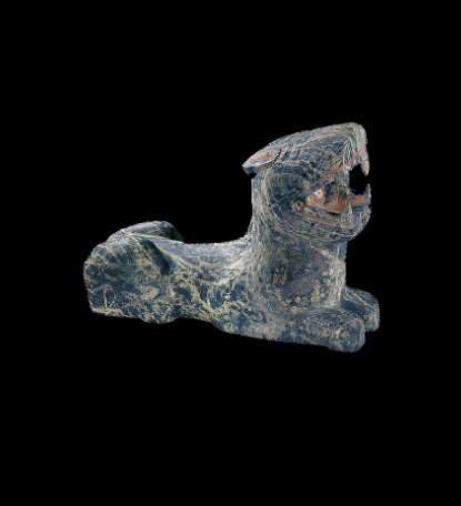 而相比于三星堆,金沙的彩绘所应用的媒介更加广泛。除了上述的青铜器眼形器和漆木器外,金沙遗址出土的石器上也有彩绘的痕迹。例如圆头圆脑的石蛇上,就有黑色和红色颜料的涂绘;石虎的口内、嘴上、耳间等部位,也涂抹了加入了朱砂的红色颜料;还有石跪坐人像的面部和身体上,同样也有红色颜料的痕迹。即便是经历了上千年的时光,这些红色依旧鲜艳。
