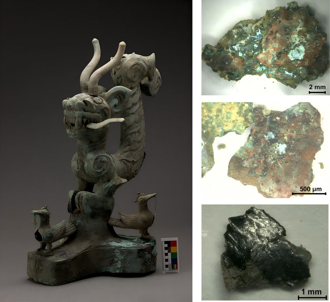 △青铜虎头龙身像,右侧图片为彩绘样品