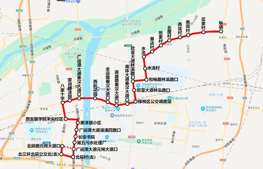 新增站点8个:水流村、和畅路林溪路口、欧亚大道林溪路口、欧亚大道林泓路口、保税区公交调度站、奥体大道秦汉大道口、鼎盛路秦汉大道口、全运路秦汉大道口。