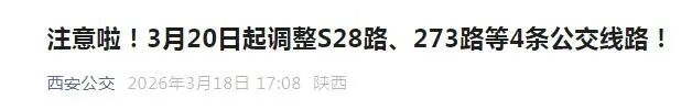 为进一步优化公交线网布局,减少线路重复,填补丰景路、林溪路等道路公交服务空白,方便市民出行。按照西安市交通运输综合执法支队批复,西安市公共交通集团有限公司将于2026年3月20日起开通S28路;3月21起调整273路,撤销145路、179路公交线路。具体信息如下: