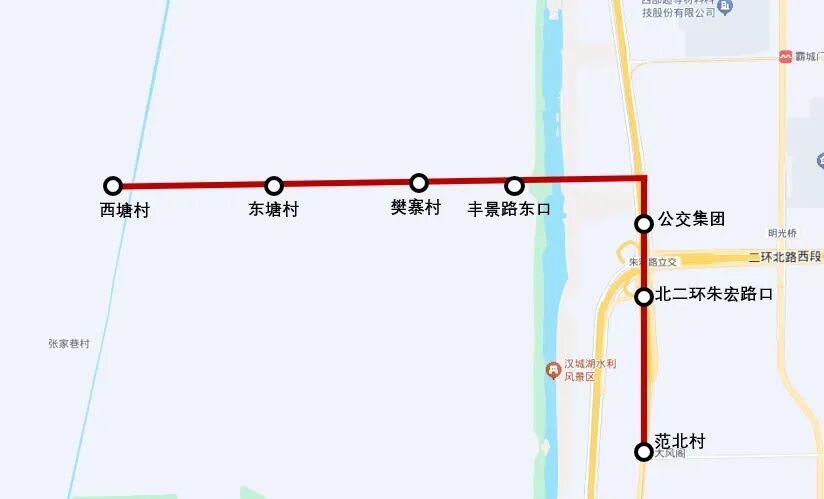 线路设置站点8个:西塘村、东塘村、樊寨村、丰景路东口、凤城二路西口(回)、公交集团、北二环朱宏路口、范北村。