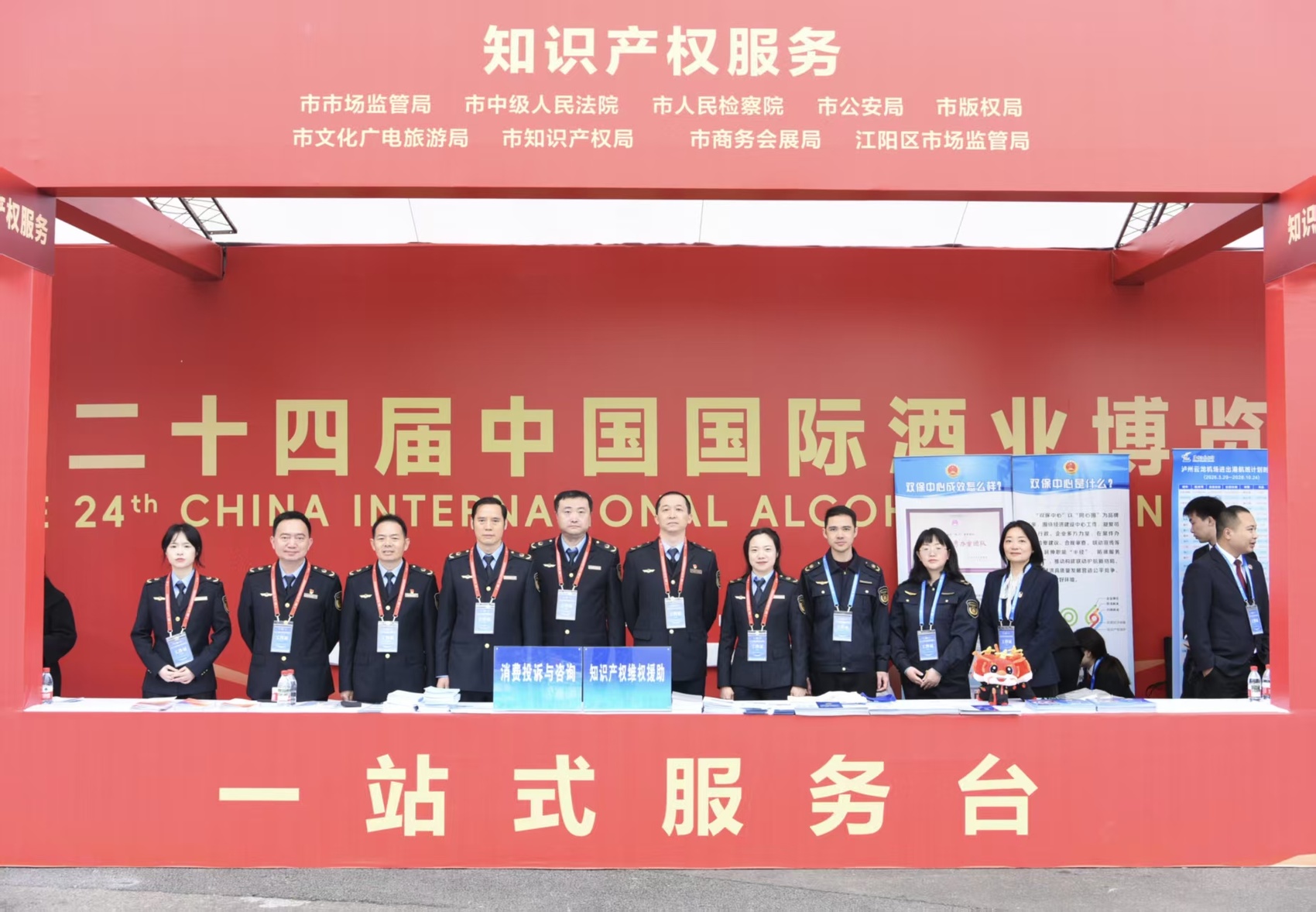 3月19日至3月22日,第二十四届中国国际酒业博览会(以下简称酒博会)在泸州举办。为做好酒博会知识产权保护服务工作,泸州市市场监管局(市知识产权局)联合市中级人民法院、市人民检察院、市公安局、市版权局、市文化广电旅游局、市商务会展局、江阳区市场监管局在展会现场设立知识产权一站式保护工作站,为参展企业和群众提供维权援助、消费投诉与咨询、纠纷快速处置等全链条、集成式服务,切实筑牢展会知识产权安全防线。
