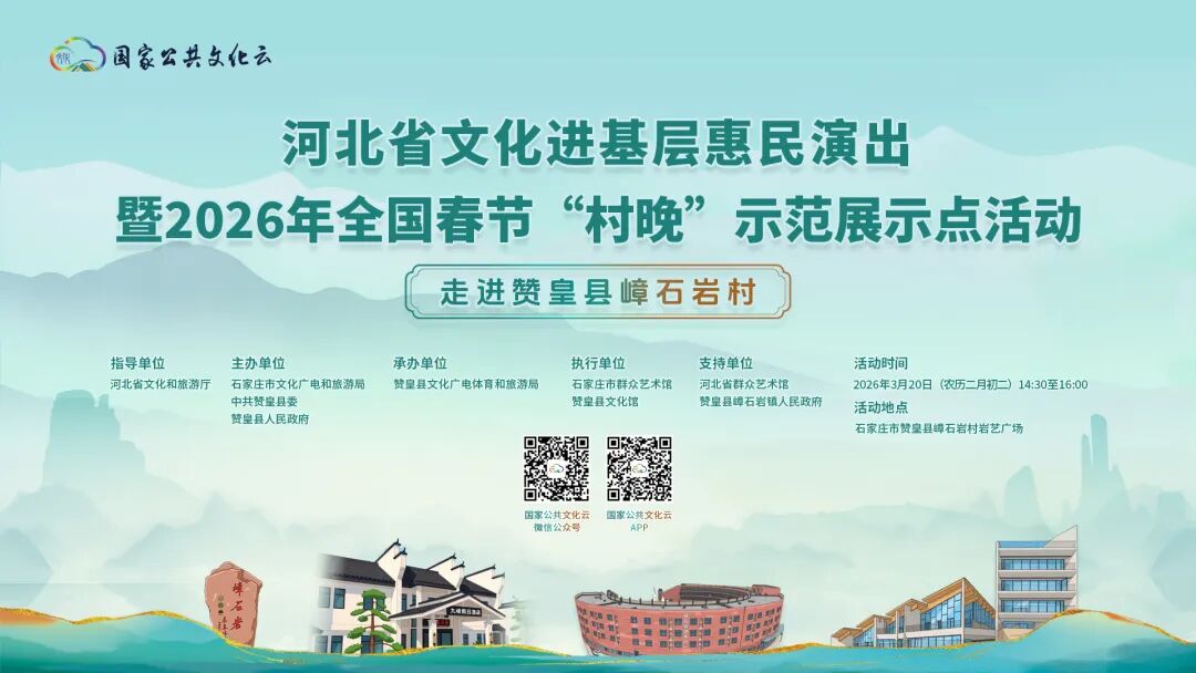 龙抬头、赏民俗、看非遗、助振兴!2026年3月20日(农历二月初二)14:30至16:00,由河北省文化和旅游厅指导,石家庄市文化广电和旅游局、中共赞皇县委、赞皇县人民政府主办,赞皇县文化广电体育和旅游局承办,石家庄市群众艺术馆、赞皇县文化馆执行,河北省群众艺术馆、赞皇县嶂石岩镇人民政府支持的“春醒燕赵·山水赞皇”河北省文化进基层惠民演出暨2026年全国春节“村晚”示范展示点活动走进赞皇县嶂石岩村活动即将在石家庄市赞皇县嶂石岩村岩艺广场火爆开演。