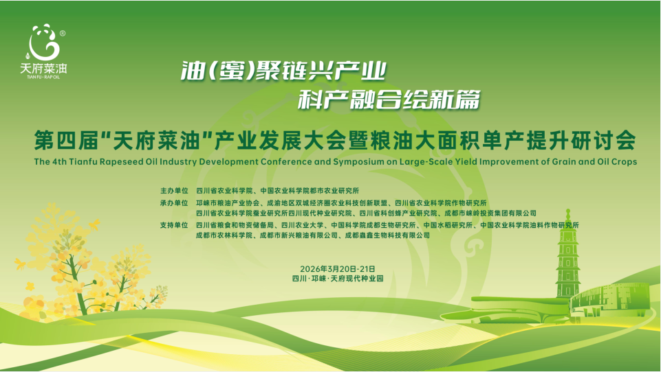 据悉,第四届“天府菜油”产业发展大会暨粮油大面积单产提升研讨会将于3月20日至21日在成都市邛崃天府现代种业园举行。本次大会由四川省农业科学院、中国农业科学院都市农业研究所主办,将汇聚院士专家、科研机构及产业代表,围绕油(蜜)产业链发展与科产融合展开深度交流。