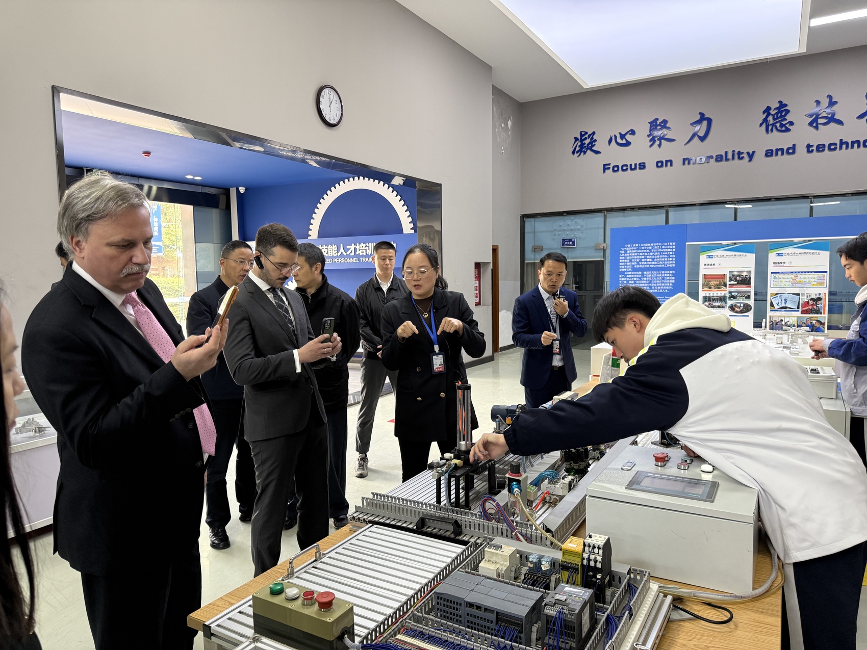 教学车间里,在学生娴熟操作下,机械臂沿预设轨迹作业。焊接瞬间,弧光一闪而过。一旁,来自德国“隐形冠军”企业及相关机构的代表们低头凑近观察,不时记录细节。