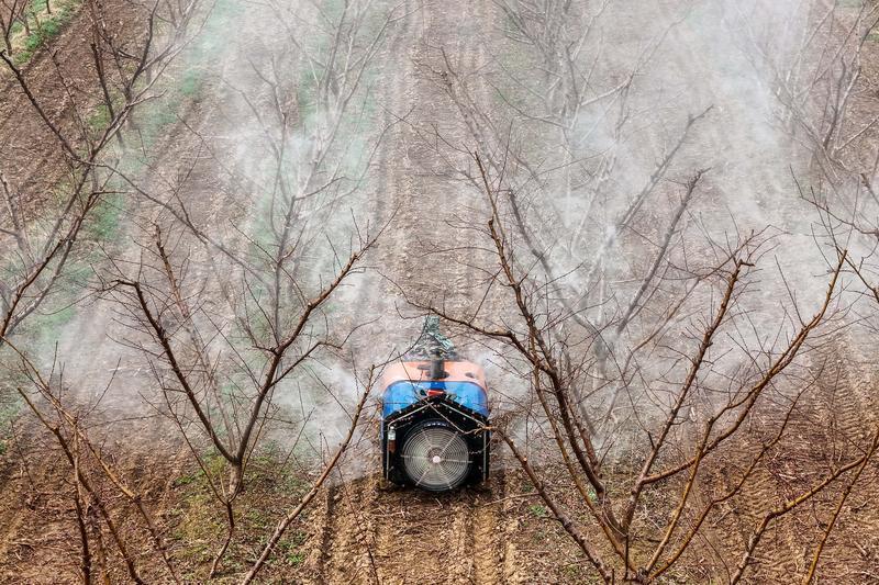 3月19日,山西省运城市平陆县张村镇的农民为果树喷洒农药(无人机照片)。