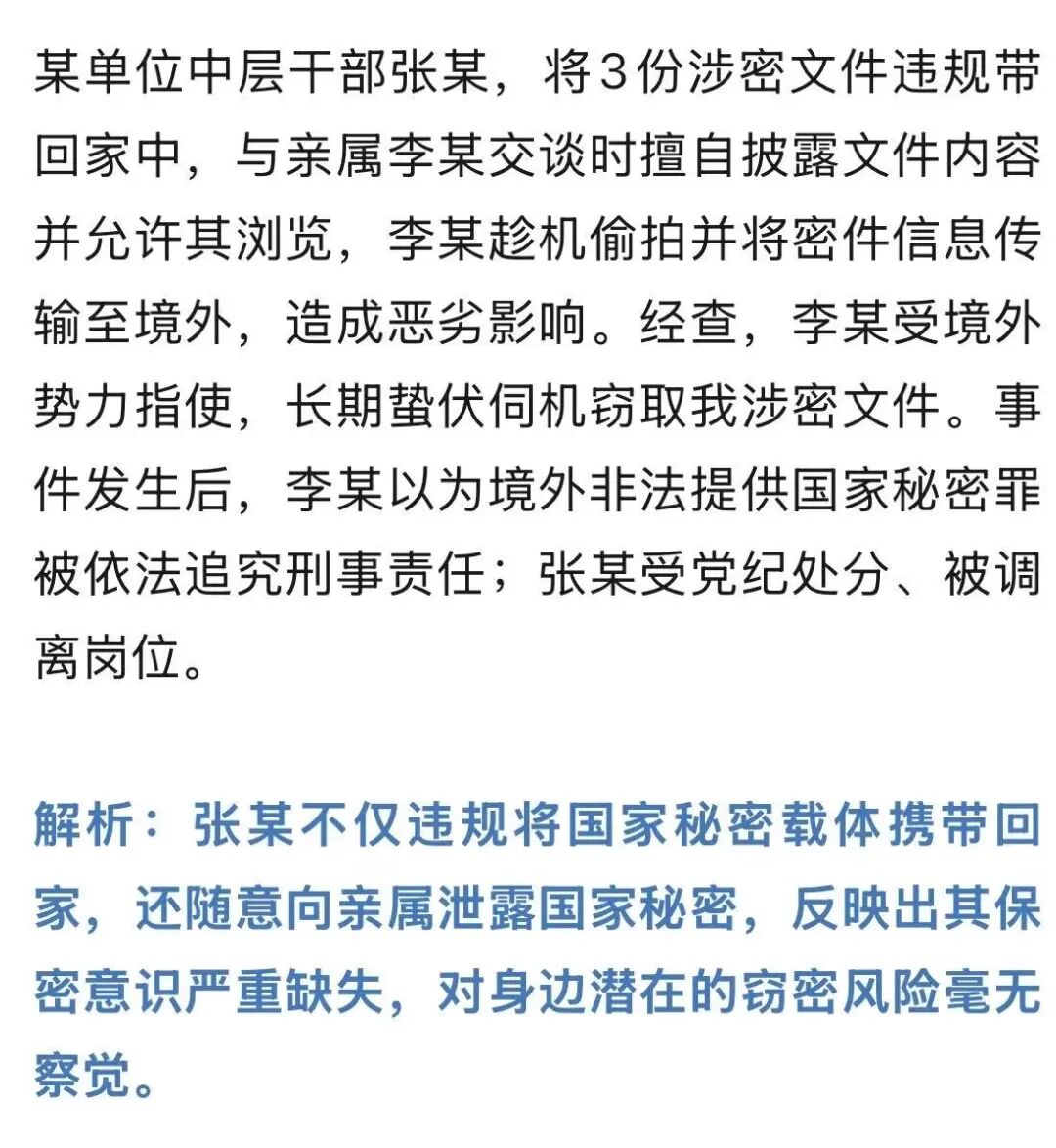 3月19日,“保密观”微信公众号发布题为《“八小时外”防线失守:携密件回家,竟遭亲属偷拍发往境外!》的文章,全文如下: