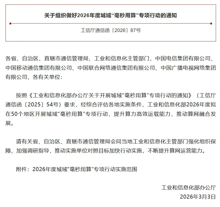 近日,工业和信息化部发布《关于组织做好2026年度城域“毫秒用算”专项行动的通知》,明确首批城域“毫秒用算”实施范围,覆盖31个省(区、市)的50个地市(区县),实施单位涵盖基础电信企业、新型互联网交换中心等多主体。其中,安徽合肥、芜湖两市入选首批名单。