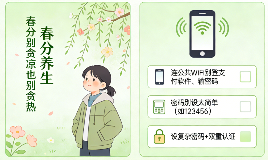 春分别贪凉也别贪热,上网别图省事忘安全!连公共WiFi的时候,别随便登支付软件、输密码;