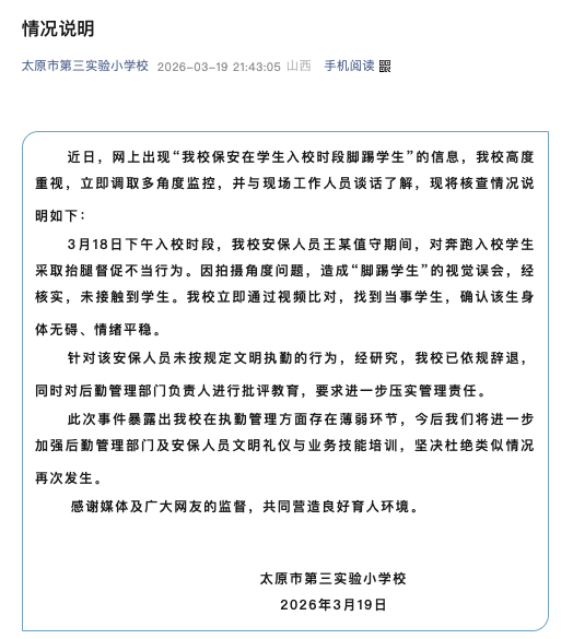 太原市第三实验小学校3月19日发布情况说明:近日,网上出现“我校保安在学生入校时段脚踢学生”的信息,我校高度重视,立即调取多角度监控,并与现场工作人员谈话了解,现将核查情况说明如下: