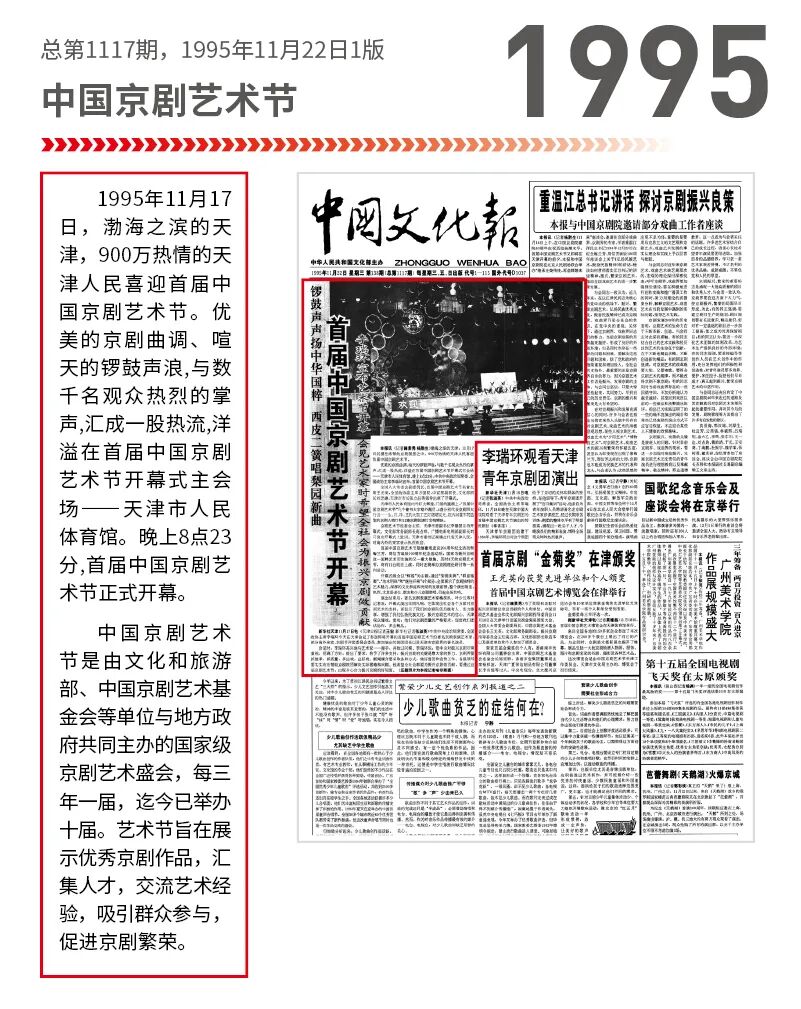 1995年11月17日,渤海之滨的天津,900万热情的天津人民喜迎首届中国京剧艺术节。优美的京剧曲调、喧天的锣鼓声浪与数千名观众热烈的掌声,汇成一股热流,洋溢在首届中国京剧艺术节开幕式主会场——天津市人民体育馆。晚上8点23分,首届中国京剧艺术节正式开幕。