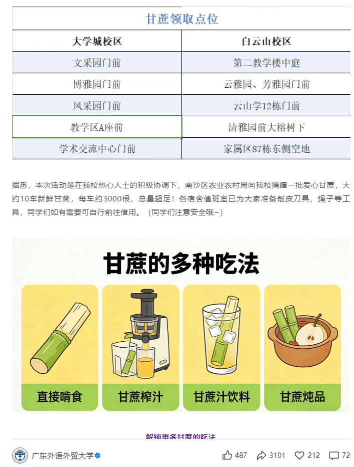3月17日,南都N视频记者从广东外语外贸大学了解到,一批爱心甘蔗在两校区、饭堂及家属区同步发放,供全体师生免费领取。
