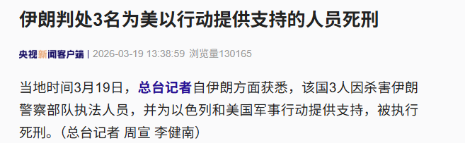 当地时间3月19日,总台记者自伊朗方面获悉,该国3人因杀害伊朗警察部队执法人员,并为以色列和美国军事行动提供支持,被执行死刑。