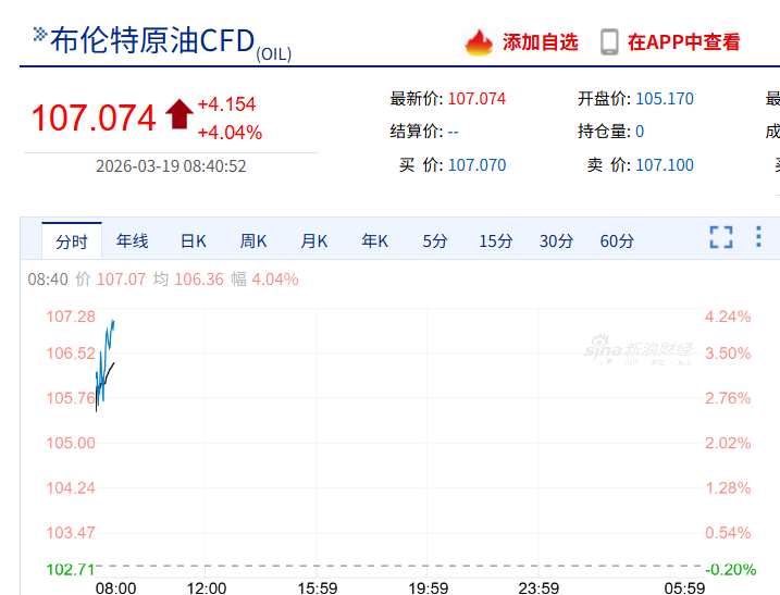 与此同时,国际油价持续大涨,截至8时40分,布伦特原油突破107美元/桶,日内涨超4%。纽约原油涨3.63%。