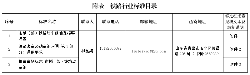 根据铁路行业技术标准管理办法的相关要求,现就《市域(郊)铁路动车组轴温报警装置》(征求意见稿)等3项铁路行业标准公开征集意见(见附表和附件1—3)。请于2026年4月19日前将《铁路行业标准征求意见表》(见附件4)通过电子邮件或信函方式实名提出反馈意见,逾期视为无意见。