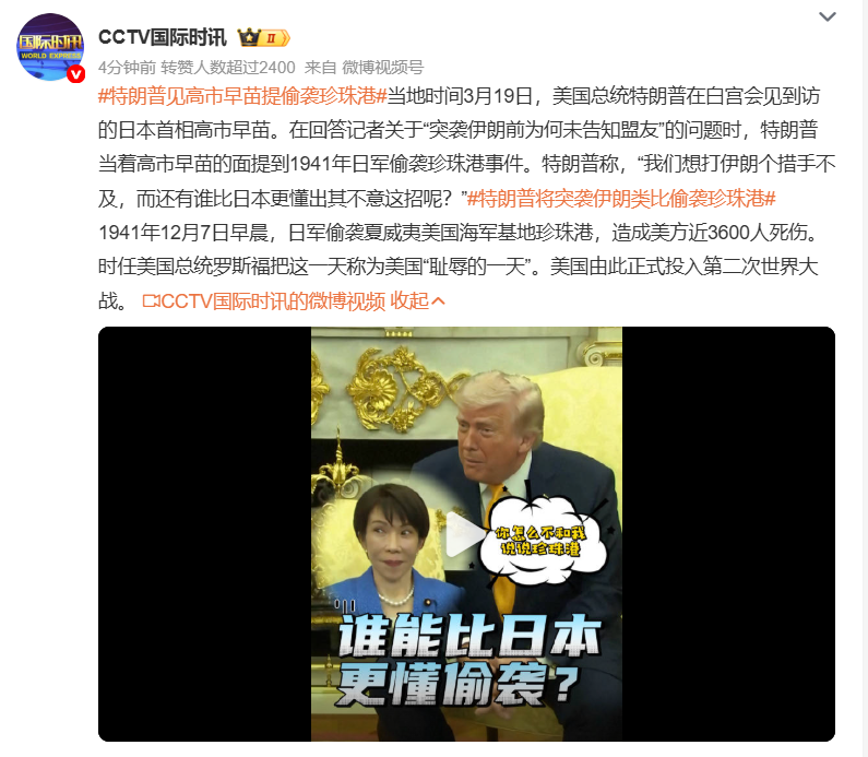 当地时间3月19日,美国总统特朗普在白宫会见到访的日本首相高市早苗。在回答记者关于“突袭伊朗前为何未告知盟友”的问题时,特朗普当着高市早苗的面提到1941年日军偷袭珍珠港事件。特朗普称,“我们想打伊朗个措手不及,而还有谁比日本更懂出其不意这招呢?”