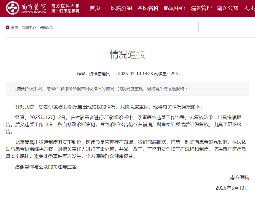 3月19日,南方医科大学南方医院发布情况通报。针对我院一患者CT影像诊断报告出现错误的情况,我院高度重视,现将有关情况通报如下: