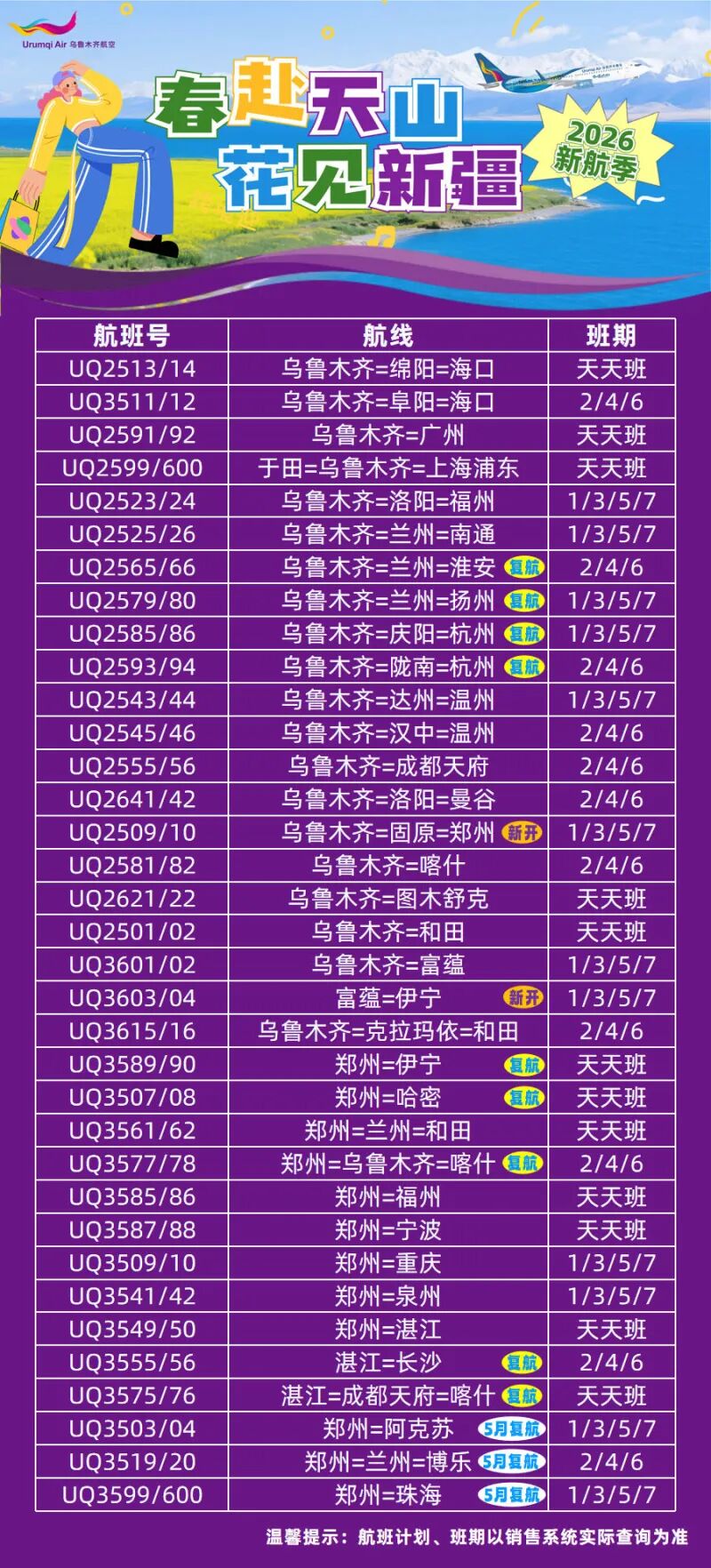 夏秋航季,乌鲁木齐航空还将恢复乌鲁木齐—兰州—淮安、乌鲁木齐—兰州—扬州、乌鲁木齐—庆阳—杭州、乌鲁木齐—陇南—杭州、郑州—伊宁、郑州—哈密、郑州—乌鲁木齐—喀什、湛江—成都天府—喀什、郑州—阿克苏、郑州—兰州—博乐、郑州—珠海等航线。
